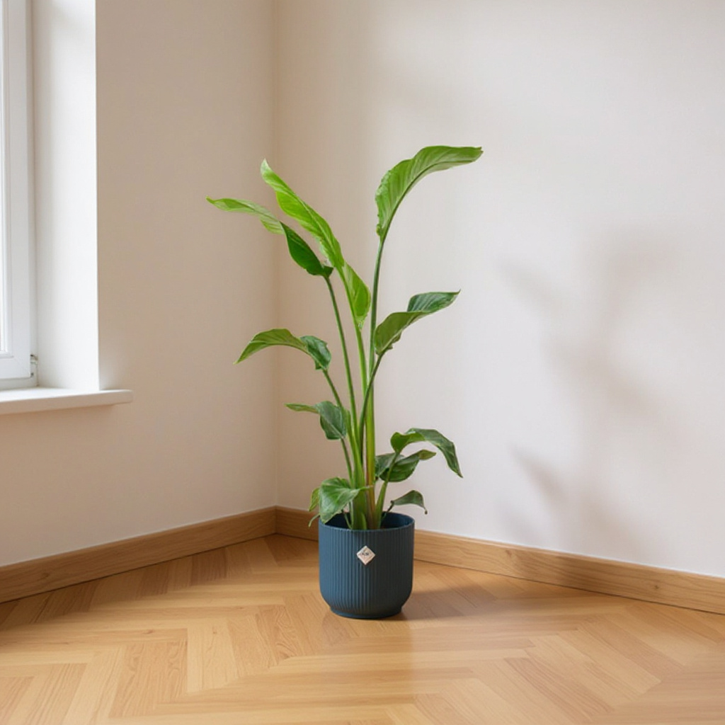 Deze combideal bevat een Strelitzia Nicolai kamerplant van 100cm hoog met een potdiameter van 22cm, gepresenteerd in een stijlvolle elho Vibes Fold Round pot in blauw. De Strelitzia Nicolai heeft grote, tropische bladeren die waaierachtig groeien. De bladeren zijn donkergroen en creëren een weelderige, exotische uitstraling. De elho Vibes Fold Round pot met zijn subtiel geribbeld patroon en eigentijds, minimalistisch design, voegt een moderne en stijlvolle toevoeging toe, perfect passend bij de diepgekleurde bladeren van de plant.