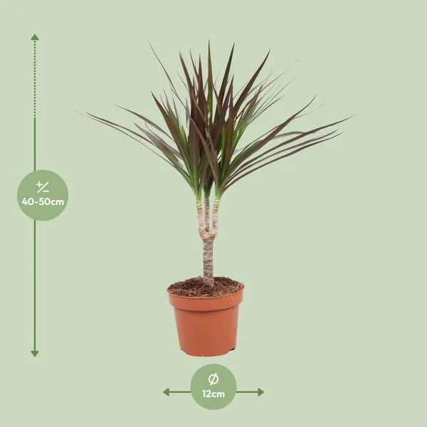 Deze plant heeft helder indirect licht – direct zonlicht kan de bladeren verbleken nodig en matig water – laat de grond tussen gietbeurten opdrogen. Gevoelig voor fluoride in leidingwater. Gebruik bij voorkeur regenwater. Met de juiste verzorging zal deze Dracaena Magenta van 50cm in een Ø12cm pot prachtig gedijen in jouw huis.