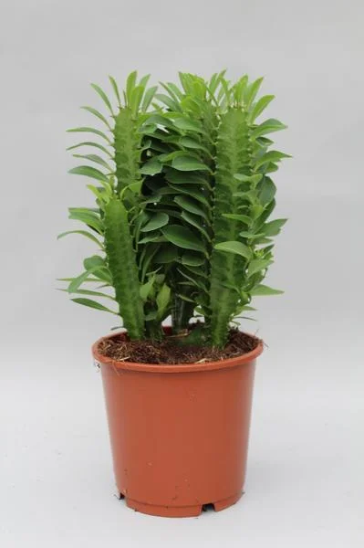 De Euphorbia Trigona, ook bekend als Afrikaanse Melkboom, heeft driekantige, groene stengels met kleine bladeren. Deze cactusachtige plant groeit rechtop en kan behoorlijk groot worden. Afkomstig uit West-Afrika, gedijt deze plant uitstekend als kamerplant en voegt een natuurlijke uitstraling toe aan elke ruimte.