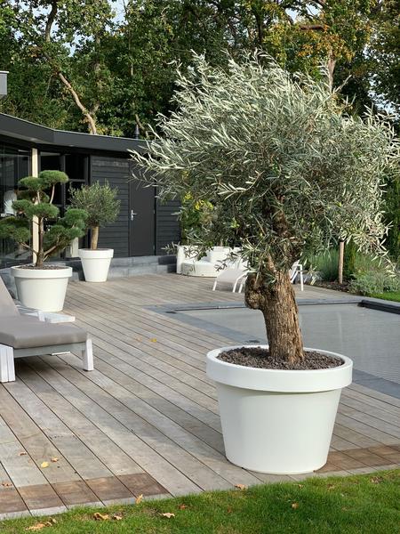 De Lira Wit pot heeft prachtige, brede bladeren met een stralende, witte kleur die een frisse en moderne uitstraling geeft. De pot is elegant van vorm en zorgt voor een levendige toevoeging aan elk interieur.