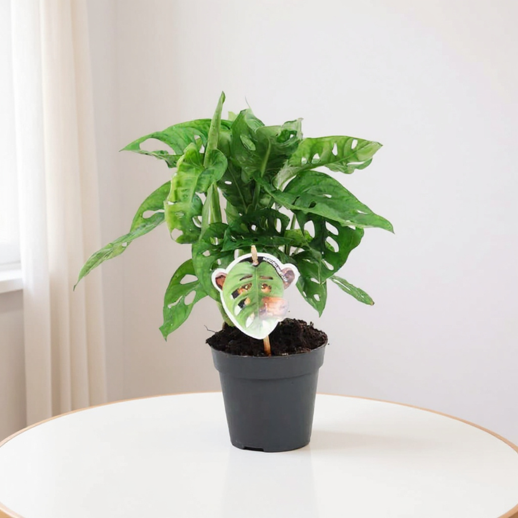 Deze plant houdt van een lichte, indirecte zonlichtplek. Het is ideaal om deze plant binnen te plaatsen, bijvoorbeeld in een woonkamer of kantoor, waar hij kan genieten van een beetje schaduw. Geef de Monstera obliqua ‘Monkey Leaf’ regelmatig water, maar laat de bovenste laag van de potgrond tussen de gietbeurten opdrogen. Dit helpt om overbewatering en wortelrot te voorkomen.